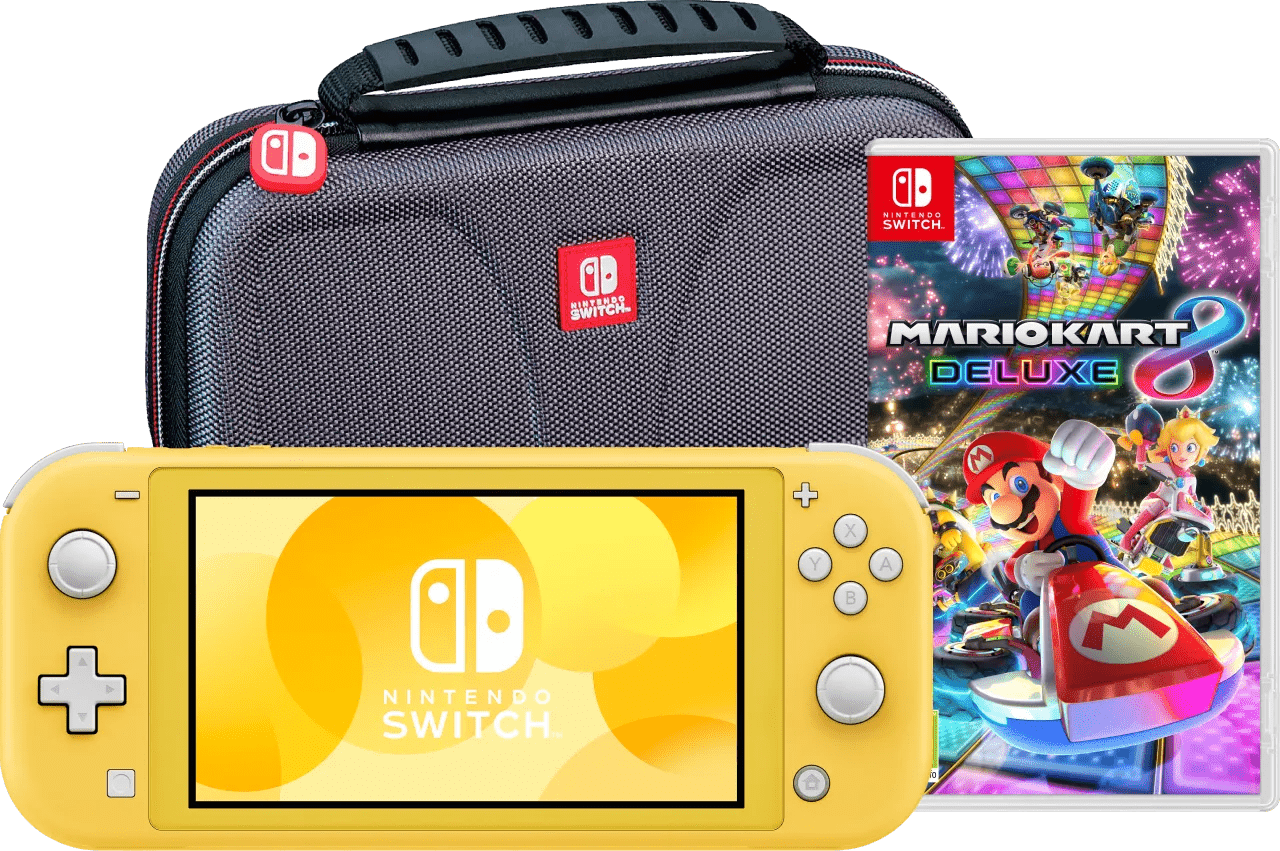 Race tegen vrienden en familie in Mario Kart 8 Deluxe met de Nintendo Switch Lite Geel en neem hem overal mee naartoe met de Bigben Beschermtas. Spring gelijk in de game en kies je favoriete Mario personage. Ontdek verschillende oude en nieuwe circuits of prik de ballonnen van je tegenstanders lek in battle mode. Ben je even klaar met spelen? Dan berg je de Nintendo Switch makkelijk op in de beschermhoes. Zo voorkom je krassen op je scherm. De Nintendo Switch Lite is de kleinere en lichtere versie van de Nintendo Switch, waardoor je hem nog makkelijker meeneemt. De Nintendo Switch Lite heeft geen losse onderdelen, waardoor de console steviger is dan de normale Nintendo Switch en geschikt is voor de jongste gamer. Ook gaat de batterij van de Nintendo Switch Lite langer mee dan van de normale Nintendo Switch, waardoor je dus langer onderweg gamet.