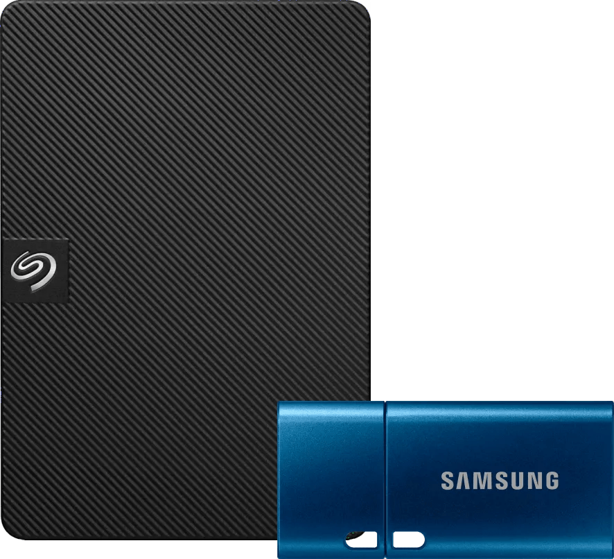 Voeg extra opslagruimte toe aan je laptop en desktop met de Seagate Expansion Portable 1TB en neem je bestanden mee in je broekzak met de Samsung USB-C Flash Drive 64GB. Deze compacte usb stick heeft een leessnelheid van 300 megabytes per seconde, waarmee je zelfs de grootste bestanden binnen enkele seconden opent. Handig wanneer je een presentatie moet geven bij een klant of grote spreadsheets mee moet nemen. Met een schrijfsnelheid van 110 megabytes per seconden is ook het overschrijven zo gepiept. Door de usb C aansluiting past de usb stick op vrijwel ieder apparaat, waaronder ook een smartphone of tablet. Daarnaast is de stick bestand tegen een stootje. Hij is namelijk bestand tegen schokken, stof, water, magnetische velden en röntgenstralen. Ook overleeft de stick temperaturen van -10 graden Celsius tot wel 70 graden Celsius. Zo blijven al je bestanden fysiek veilig. De grote bestanden bewaar je op de Seagate Expansion Portable 1TB externe harde schijf. Met 1 terabyte aan opslag sla je tot 500.000 foto’s op of tot 500 uur aan HD filmmateriaal. De Expansion Portable is al geformatteerd voor Windows computers en is dus binnen een handomdraai te gebruiken. Via de usb 3.0 verbinding zet je bestanden zoals een full hd film of een fotocollectie in ongeveer 15 seconden over. Daarnaast ontvang je 2 jaar aan data herstel services vanuit Seagate, mocht de schijf kapot gaan. Door de combinatie van de harde schijf en usb stick heb je altijd 2 draagbare opslagruimtes tot je beschikking. Waar de HDD extra veel opslag biedt, is de usb stick een goede oplossing om je documenten mee op reis te nemen.