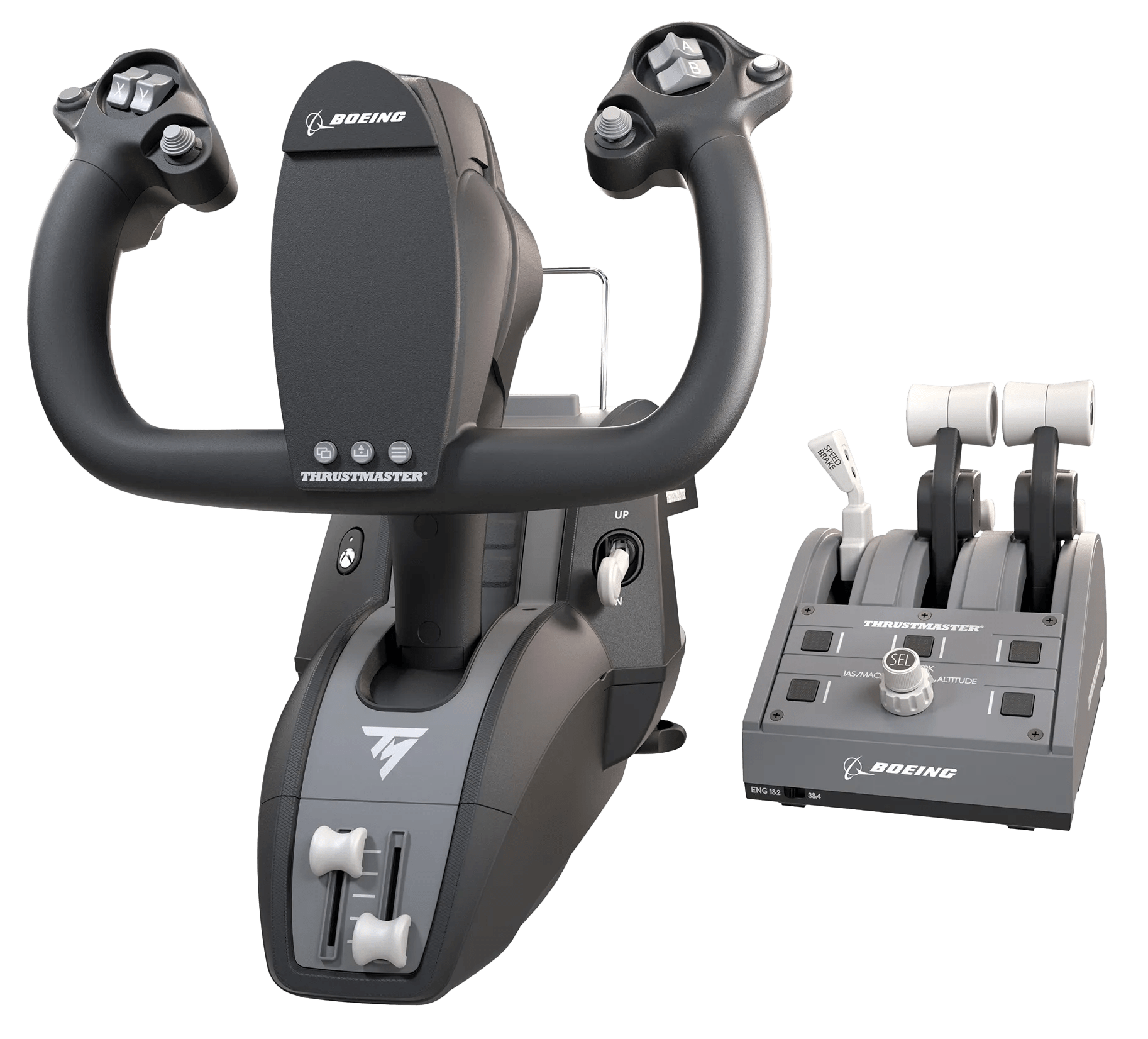 Bestuur de grootste vliegtuigen in Flight Simulator met de Thrustmaster TCA Yoke Pack Boeing Edition voor Xbox en pc. Deze flightstick heeft een stuurknuppel met een slinger mechanisme, die je ook vindt in Boeing vliegtuigen. Hierdoor wordt het vliegen van Boeing vliegtuigen nog realistischer. De yoke heeft 2 assen, waardoor je gelijk opstijgt zonder throttle. Ook is het frame van metaal, waardoor deze flightstick lang mee gaat. Wil je iets meer weerstand tijdens het vliegen? Dan pas je makkelijk de interne vering aan van de yoke. Verder zit er in dit pakket ook een Quadrant joystick. Deze joystick heeft een H.E.A.R.T systeem voor realistisch vliegavontuur en Boeing Auto-Pilot, geïnspireerd door de Dreamliner.