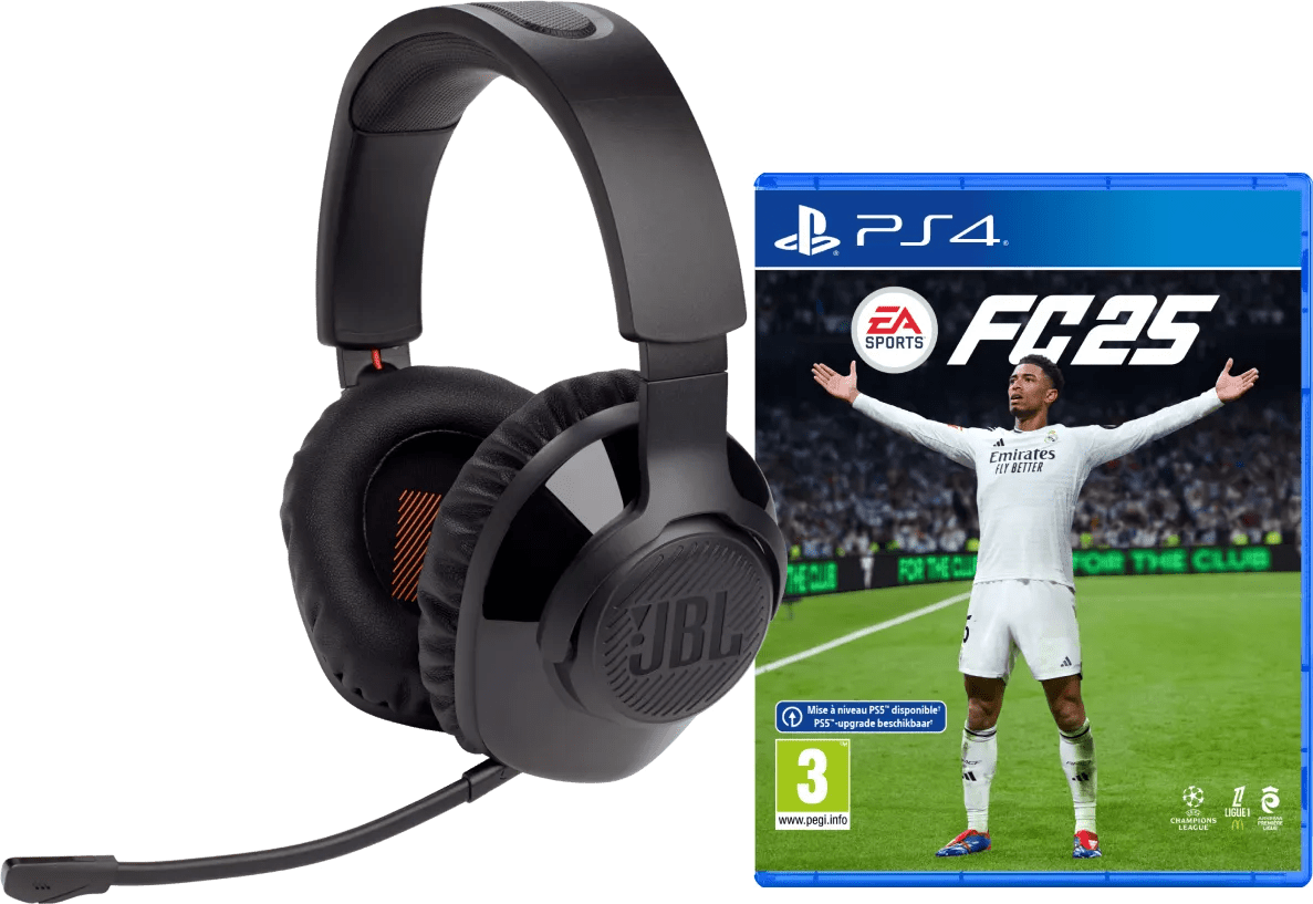 Hoor de fans jouw team aanmoedigen in FC 25 met de JBL Quantum 350 Wireless. Je koppelt deze headset draadloos aan je pc of PlayStation via de usb A dongel. Zo heb je geen last van kabels tijdens het gamen. Deze headset laad je binnen 5 minuten voor één uur op. Zo game je snel verder. Met surround sound hoor je al het gamegeluid in 360 graden om je heen, waardoor je precies weet waar jouw tegenstanders vandaan komen. Zo ben je jouw tegenstanders altijd een stapje voor. De gemiddelde batterijduur van de headset is 22 uur. Je speelt dus lang door zonder dat je de headset oplaadt. Speel je vaak alleen of heb je geen microfoon nodig? Dan verwijder je de microfoon gemakkelijk van de headset.