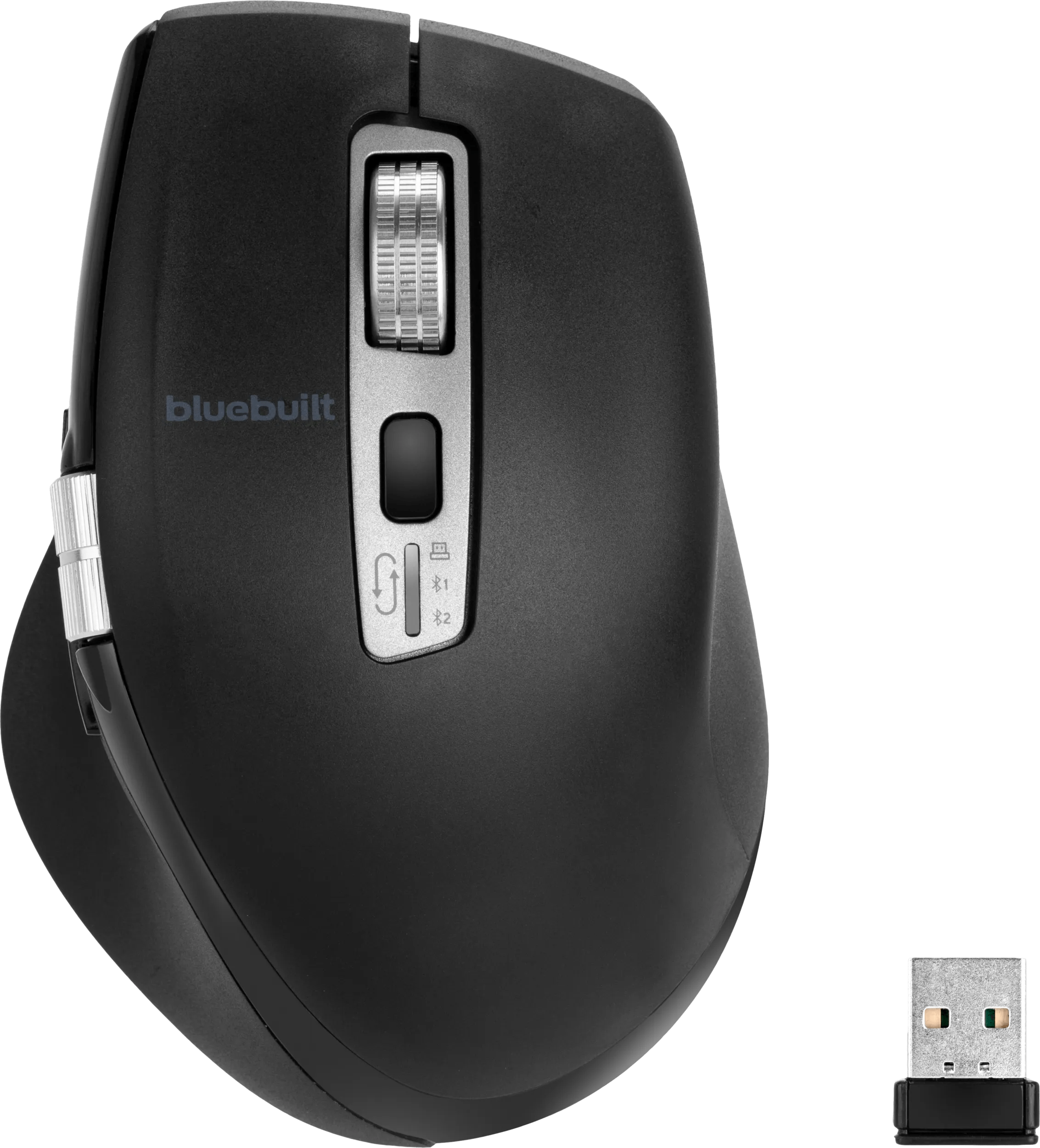 Met de BlueBuilt Maximus Draadloze Ergonomische Bluetooth Muis werk je productief en comfortabel op meerdere apparaten tegelijkertijd. Sluit de muis aan via de meegeleverde usb ontvanger op je laptop of desktop of gebruik bluetooth. Via de verbindingsknop onderaan de muis wissel je gemakkelijk tussen verschillende apparaten, zoals je werk laptop en je desktop thuis. Werk je veel in spreadsheets? Dan scrol je met het horizontale scrollwiel gemakkelijk door al je data heen. Naast dit scrollwiel vind je ook 2 duimknoppen aan de zijkant van de muis. Hiermee navigeer je gemakkelijk tussen pagina’s. Nog sneller scrollen? Gebruik dan het smart flying scrollwiel. Hiermee vlieg je door duizenden Excel regels per seconde. Verder heeft de Maximus een ergonomisch ontwerp, waardoor je minder snel last krijgt van arm- en polsklachten. Is de batterij leeg? Dan laad je hem gemakkelijk binnen 2 tot 4 uur op met de meegeleverde oplaadkabel.