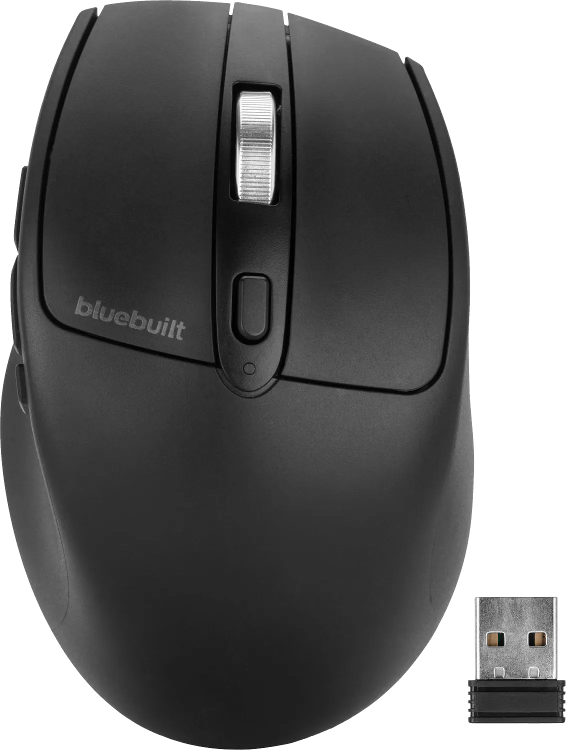 Met de BlueBuilt Nexum Pro Draadloze Muis maak jij je geen zorgen over je productiviteit. Steek de meegeleverde usb A ontvanger in jouw laptop of desktop en je gaat direct aan de slag. Je navigeert snel en makkelijk door je browser en programma’s met de duimknoppen aan de zijkant van de muis. De derde duimknop is een home knop, waarmee je snel je bureaublad erbij pakt. Het indicatielampje achter de dpi knop wordt rood wanneer de batterij bijna leeg is. Zo weet je gelijk wanneer de muis opgeladen moet worden. Daarnaast stel je de dpi in tussen 800 en 1.600. Je krijgt 5 jaar garantie op deze muis. Is de batterij leeg? Dan laad je hem gemakkelijk binnen 2 tot 4 uur op met de meegeleverde oplaadkabel.