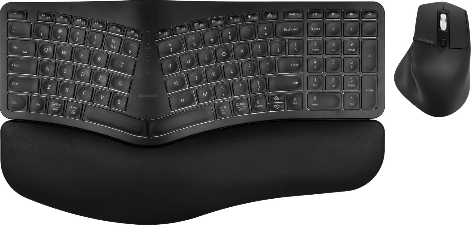 Met de BlueBuilt Draadloos Ergonomisch Bluetooth Toetsenbord Pro QWERTY + Draadloze Ergonomische Bluetooth Muis set werk je extra comfortabel. Het toetsenbord is in 2 delen gesplitst, waardoor je vingers geen overbodige bewegingen maken en je handen in een natuurlijke houding blijven. Je armen en polsen nemen ook een betere houding aan doordat het toetsenbord in een hoek loopt. De polssteun geeft daarnaast extra comfort. De toetsen van het toetsenbord zijn verlicht, waardoor je op ieder tijdstip de juiste toetsen indrukt. Met de Imperium muis navigeer je comfortabel door programma’s. Je wisselt gemakkelijk tussen pagina’s en mappen met de duimknoppen en bepaalt zelf hoe hoog de dpi is. Je sluit deze set aan op je laptop of desktop via bluetooth of de meegeleverde usb A ontvangers. Je laadt het toetsenbord en de muis in ongeveer 2 tot 4 uur volledig op.