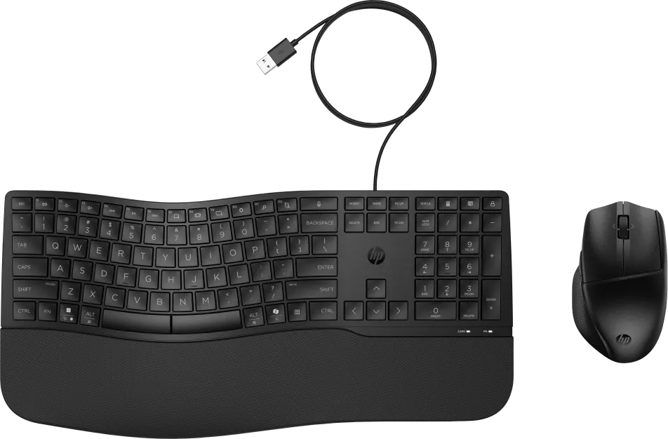 Met de HP 480 toetsenbord + muis bundel ga je ergonomisch en comfortabel aan het werk. Je gebruikt de muis op elk type ondergrond door de Multi-Surface Sensor. Hierdoor wissel je zonder problemen van werkplek. Door het golvende ontwerp en de polssteun houd je jouw handen en polsen in een natuurlijke houding. Je verstelt het toetsenbord in de hoogte bij zowel de polssteun als aan de bovenkant van het toetsenbord. Op deze manier bepaal je zelf wat voor jou het prettigst werkt. Tijdens het typen raak je niet snel afgeleid, want het toetsenbord heeft stille toetsen. Wil je nog productiever werken? Druk dan de Copilot toets in en gebruik meteen handige AI functies. Hiermee vind je gemakkelijk antwoord op je vragen, personaliseer je jouw apps of ga je creatief aan de slag met teksten en beelden. Doordat het toetsenbord bedraad is, sluit je hem gemakkelijk aan op je laptop of desktop via usb A en ga je meteen aan het werk. Verder is de HP 480 gemaakt met minimaal 55 procent gerecycled materiaal.