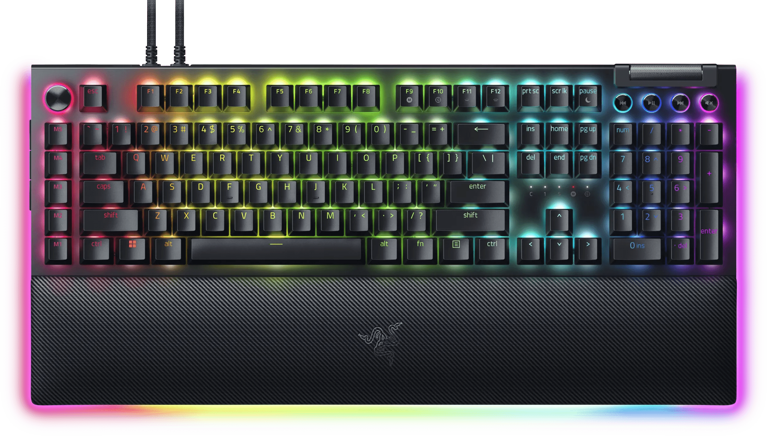Voel de feedback met elke toetsaanslag met de Razer BlackWidow V4 Pro. Dit bedrade gaming toetsenbord heeft groene, mechanische switches. Dit wordt ook wel clicky genoemd en hierdoor hoor en voel je de feedback wanneer je een toets indrukt. Met de Razer Command Dial verander je verschillende dingen met één draai aan de knop. Zo wissel je tussen verschillende apps en tabbladen of stel je de helderheid van je gaming toetsenbord in. Verder stel je de 8 extra macro toetsen in hoe jij wilt. Zo gebruik je met één druk op de knop de juiste aanval in je game. Dit is een volledig gaming toetsenbord met een numeriek blok. Hierdoor gebruik je jouw gaming toetsenbord ook voor andere dingen dan gaming. Je sluit dit gaming toetsenbord aan met de usb C naar usb A kabel. Hierdoor is het toetsenbord plug and play, waardoor je hem gelijk gebruikt. Stel zelf de RGB verlichting in per toets via de Razer Synapse software en kies tussen 16,8 miljoen kleuren. Zo past jouw gaming toetsenbord bij de rest van je setup.
