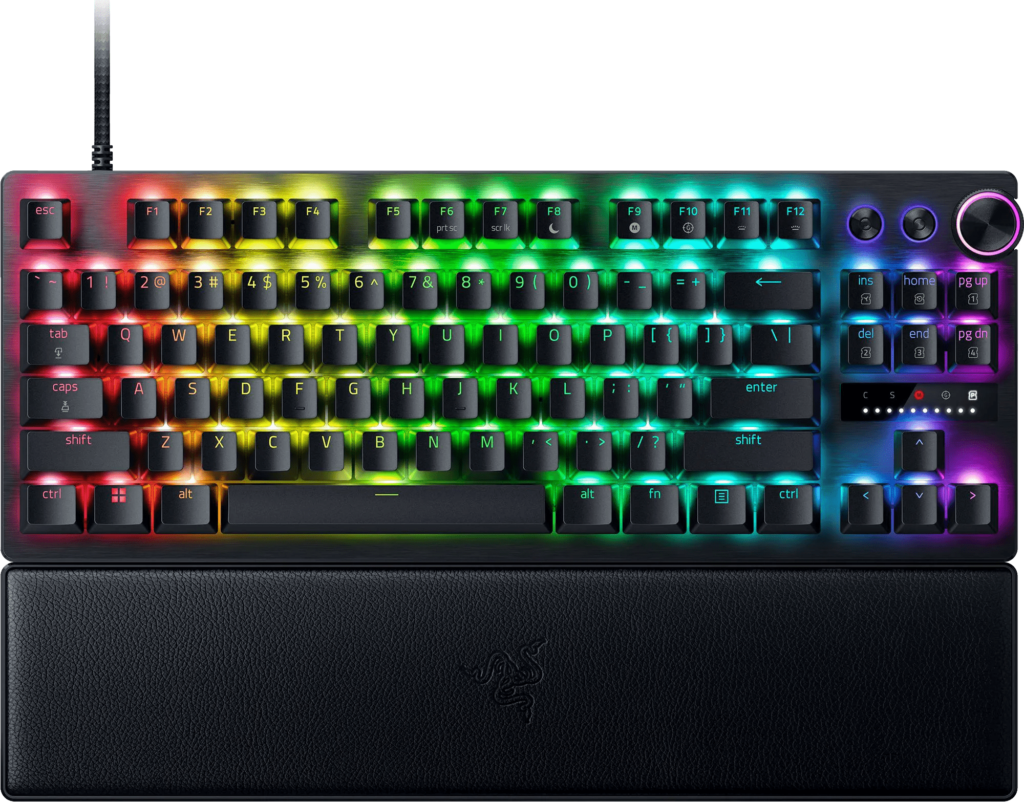 Speel je games altijd met nauwkeurige toetsaanslagen met het Razer Huntsman V3 Pro TKL Gaming Toetsenbord. Dit bedrade gaming toetsenbord heeft Razer Gen-2 optische toetsen, wat ervoor zorgt dat je comfortabel en nauwkeurig gamet. Met een instelbaar actuatiepunt tussen de 0,1 en 4 millimeter stel jij zelf in wanneer jouw toets registreert. Bedien je volume via de dedicated media knoppen op je gaming toetsenbord en wissel snel naar je favoriete nummer op Spotify. Een TKL gaming toetsenbord is een toetsenbord zonder numeriek blok. Hierdoor neem je hem makkelijk mee naar een LAN party. Je sluit dit gaming toetsenbord aan met de usb C naar usb A kabel. Hierdoor is het toetsenbord plug and play, waardoor je hem gelijk gebruikt. Stel zelf de RGB verlichting in per toets via de Razer Synapse software en kies tussen 16,8 miljoen kleuren. Zo past jouw gaming toetsenbord bij de rest van je setup.